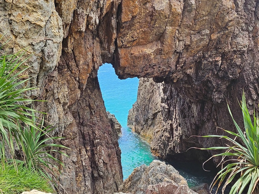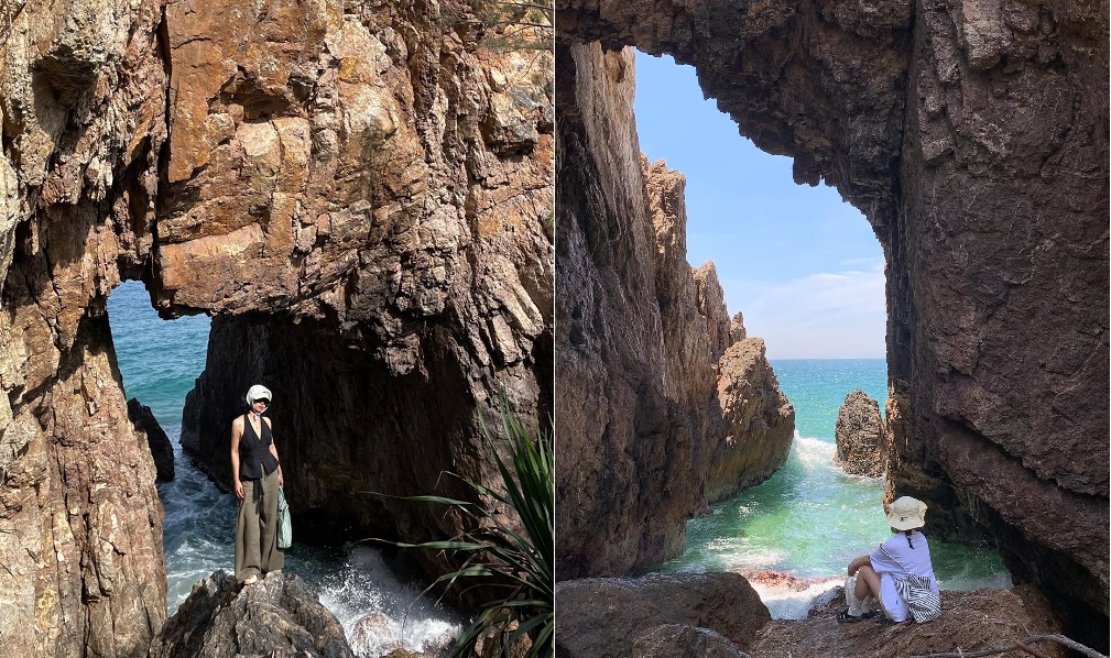 Cái tên Mũi Vi Rồng không chỉ là truyền thuyết. Nhìn từ xa, ngọn núi đá nhấp nhô, xếp lớp như những chiếc vảy rồng cứng cáp. Điểm nhấn ấn tượng nhất chính là một hang động lộ thiên xuyên qua lòng núi đá.