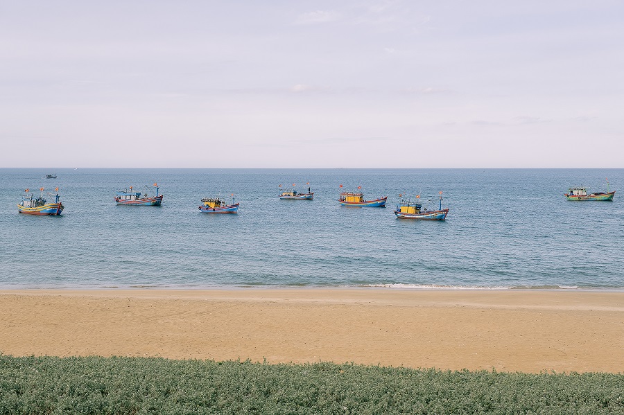 > Gợi ý góc ảnh đẹp: Hãy leo lên những mỏm đá cao nhất. Từ đây, bạn sẽ thấy sự tương phản tuyệt vời giữa màu đá xám xịt, biển xanh ngắt và những con tàu đánh cá nhỏ xíu của làng Tân Phụng.